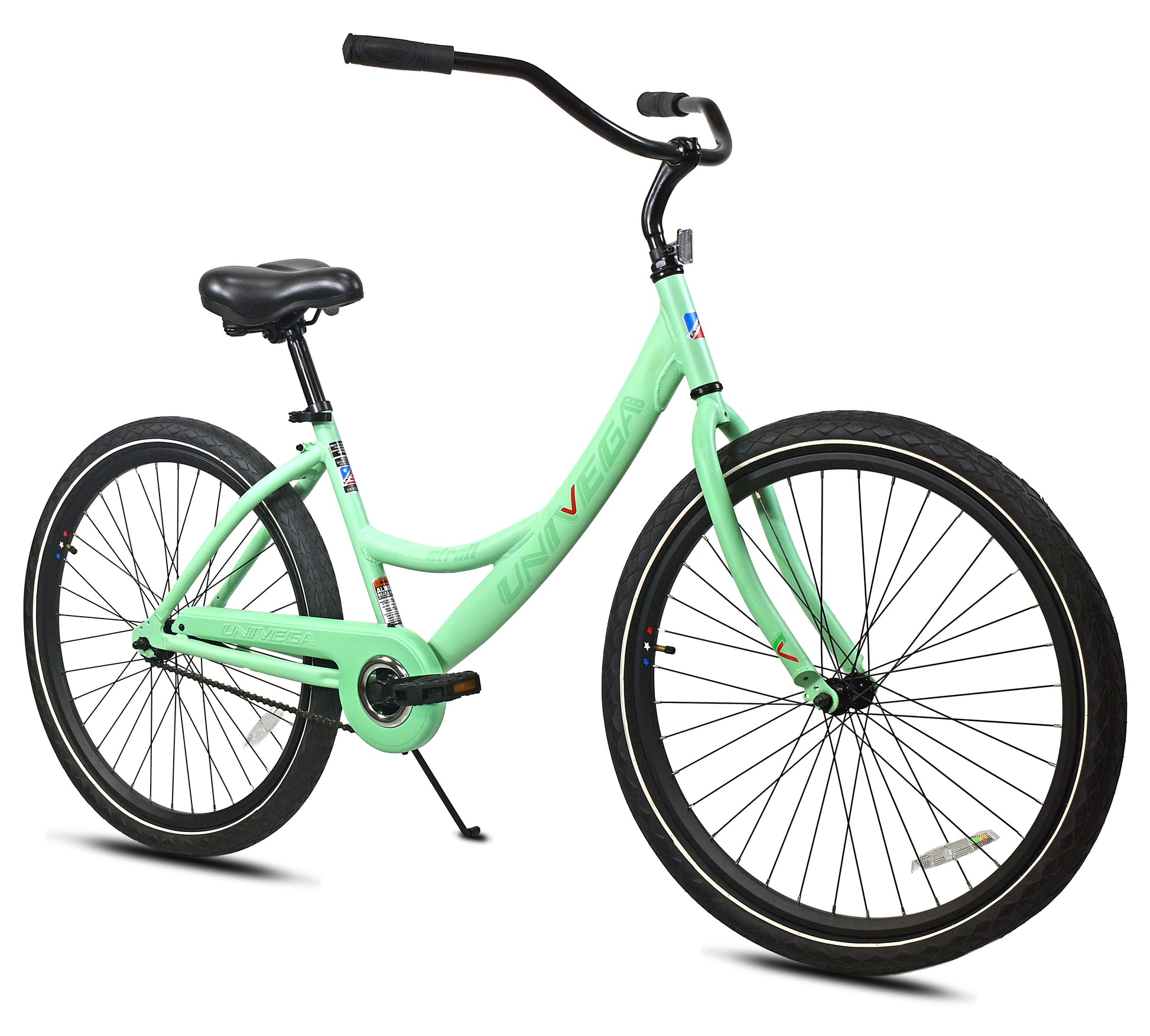 The 26" Univega USA® Weekend Stroll is your go-to bike for relaxed rides, weekend cruising, and everyday neighborhood adventures. Its lightweight aluminum step-thru frame makes getting on and off easy, while the swept-back cruiser handlebar keeps you riding in a comfortable, upright position. With 26" × 2.4" cruiser tires, a smooth-rolling double-wall alloy wheelset, and a simple rear coaster brake, this bike delivers classic cruiser vibes with modern durability. A deluxe comfort saddle and soft rubber grips round out a ride that feels as good as it looks.