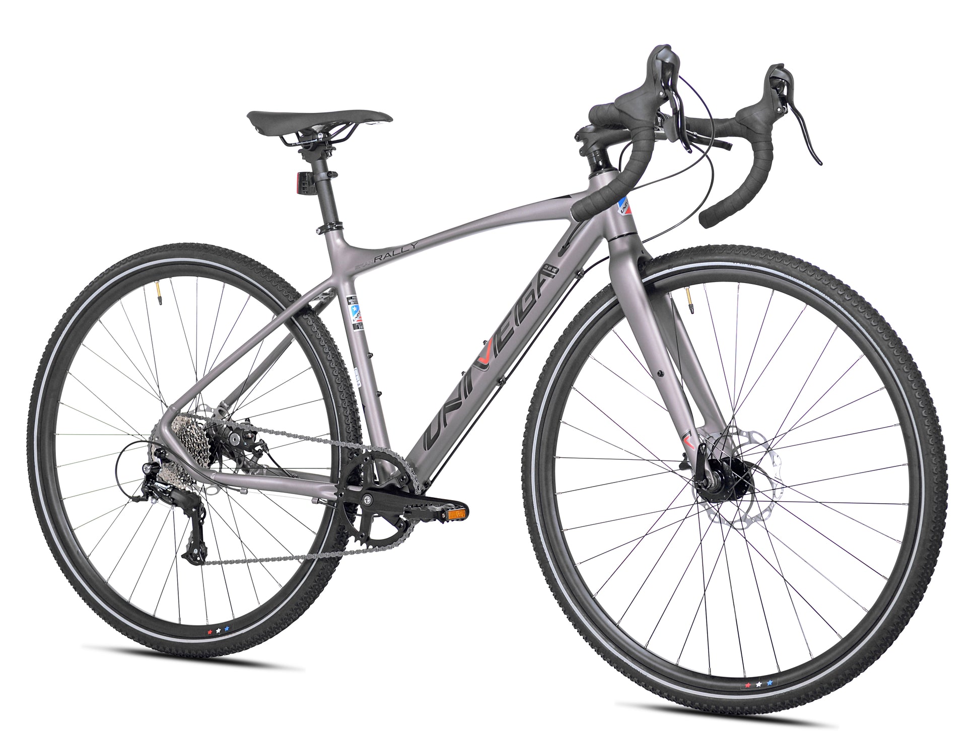 The 700c Univega USA® Gran Rally is built for riders who want speed, control, and versatility in one lightweight package. Its smooth-welded alloy frameset delivers a responsive, efficient feel, while the 700c × 38c gravel tires add stability and traction across pavement, packed paths, and rougher transitions. Whether you're training, commuting, or exploring new routes, the Gran Rally gives you the confidence to push your pace. Equipped with a full Microshift R9 9-speed drivetrain, the bike offers crisp, reliable shifting and balanced gearing for climbs, flats, and descents. Mechanical disc brakes with additional cross-top levers give you dependable stopping power and multiple hand-positions for control. Paired with performance-tuned touchpoints, including a shallow-drop bar and road performance saddle, the Gran Rally is ready for long miles and fast mornings.